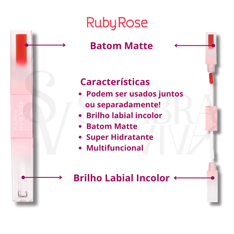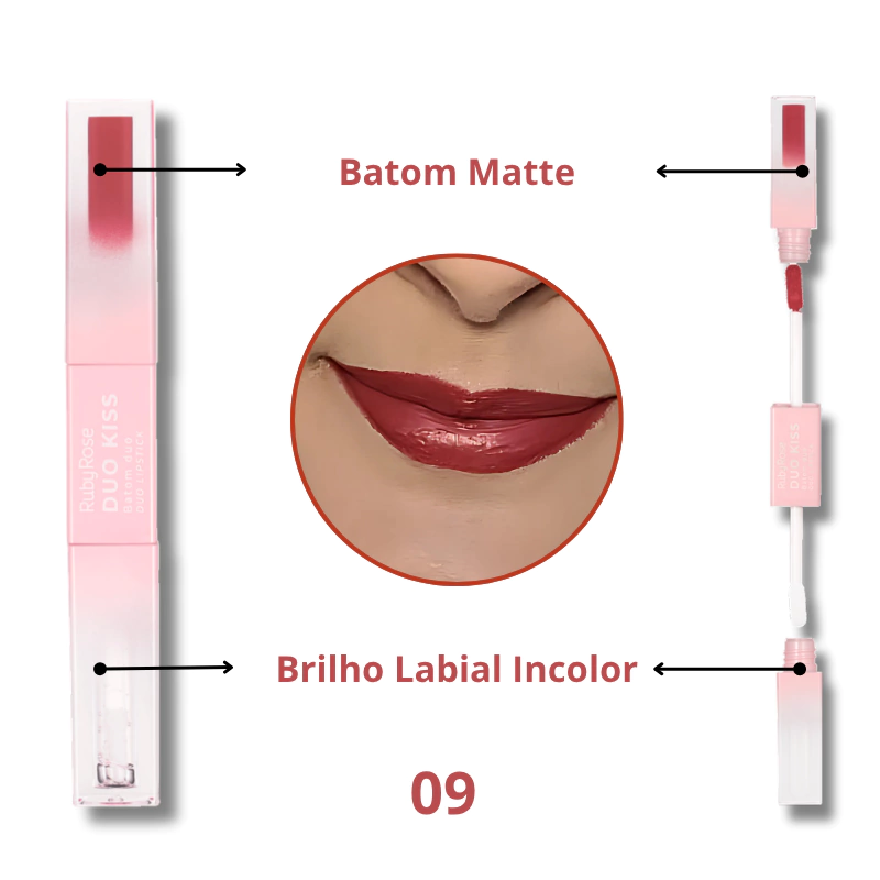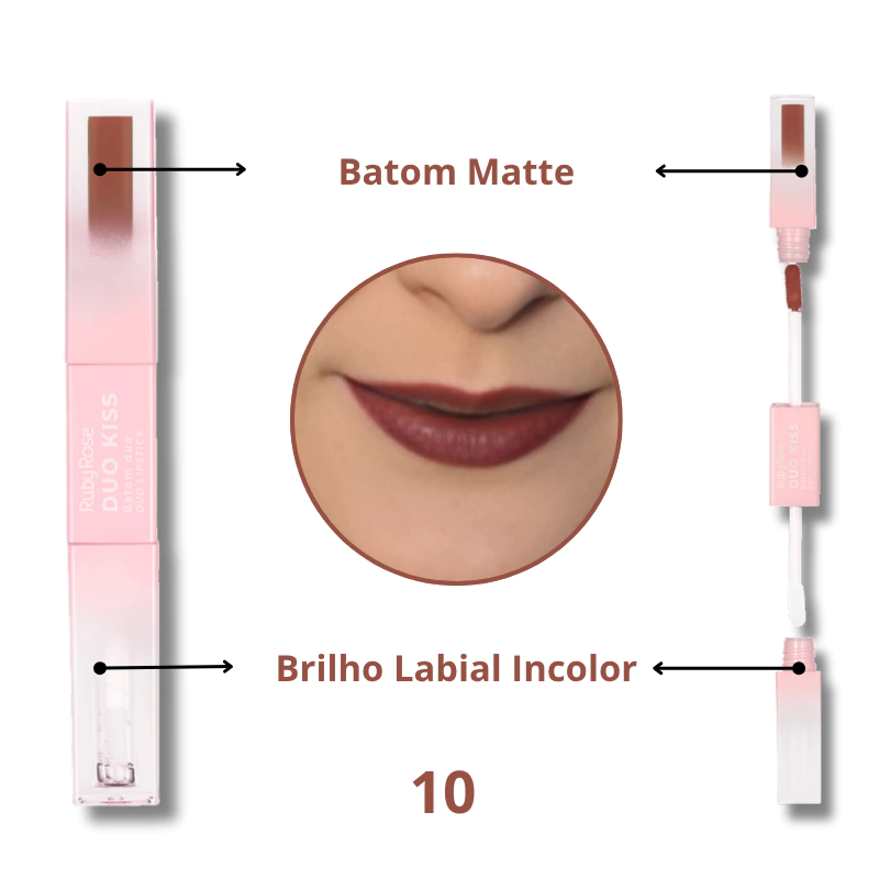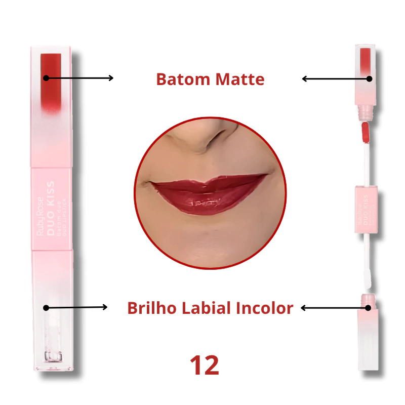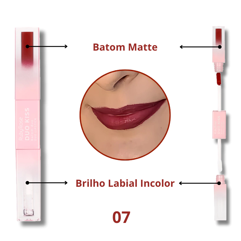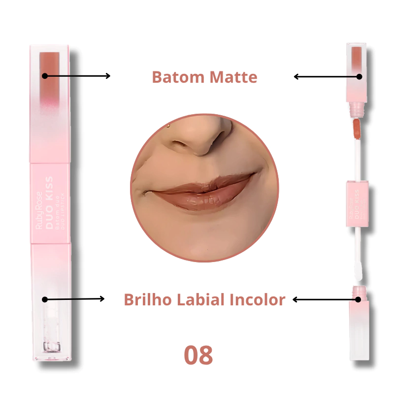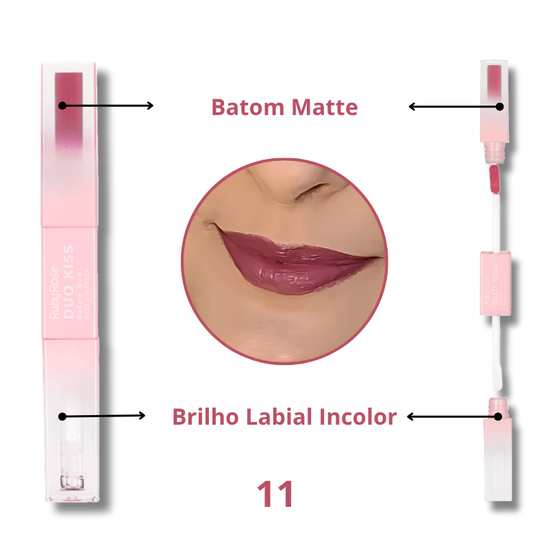 Eleve seu look com o Batom Duo Kiss da Ruby Rose, o queridinho 2 em 1 que une cor intensa e acabamento versátil. De um lado, um batom líquido matte com alta pigmentação e longa fixação. Do outro, um gloss incolor para dar aquele toque de brilho elegante quando quiser.