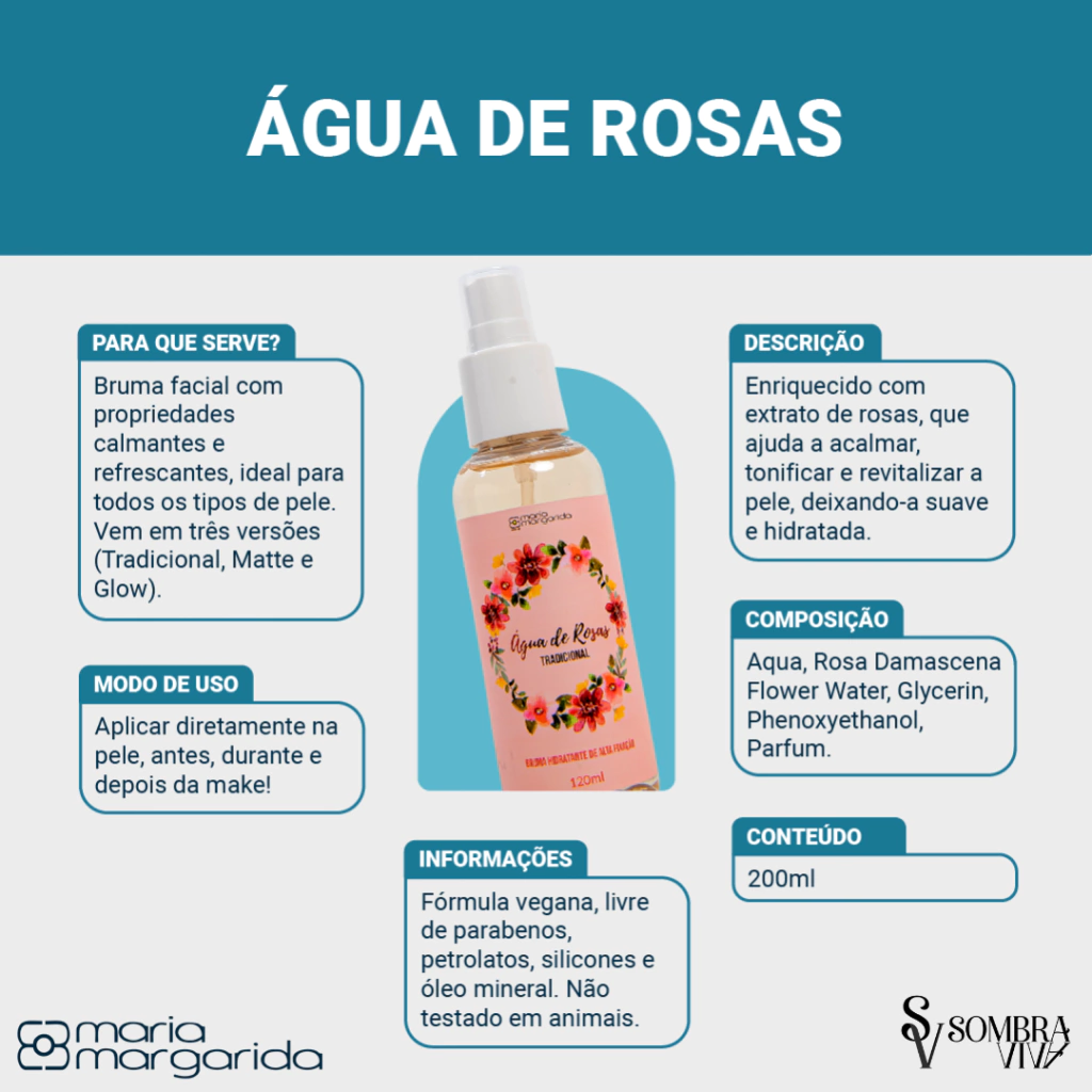 A Bruma Fixadora e Hidratante Água de Rosas Maria Margarida é uma linha de produtos que oferece três versões: Tradicional, Matte e Glow, cada uma com benefícios específicos para diferentes necessidades da pele. Todas as versões são veganas, livres de parabenos, petrolatos, silicones e óleo mineral, e não são testadas em animais.