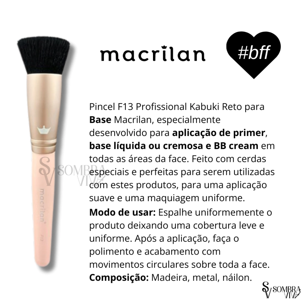 Pincel F13 Profissional Kabuki Reto para Base Macrilan, especialmente desenvolvido para aplicação de primer, base líquida ou cremosa e BB cream em todas as áreas da face. Feito com cerdas especiais e perfeitas para serem utilizadas com estes produtos, para uma aplicação suave e uma maquiagem uniforme.
