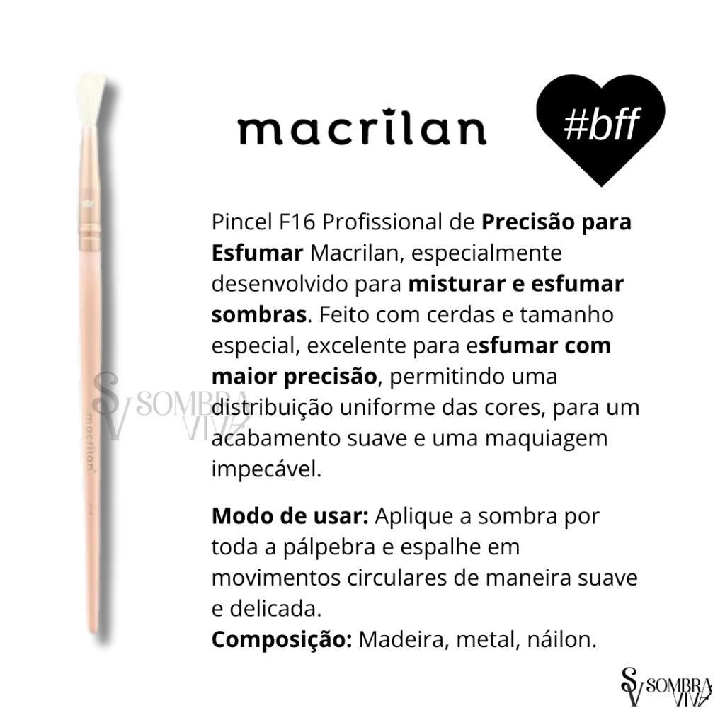Pincel F16 Profissional de Precisão para Esfumar Macrilan, especialmente desenvolvido para misturar e esfumar sombras. Feito com cerdas e tamanho especial, excelente para esfumar com maior precisão, permitindo uma distribuição uniforme das cores, para um acabamento suave e uma maquiagem impecável.
